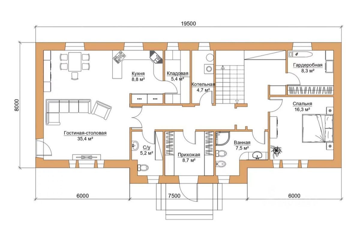 - Высота потолков 1го этажа 3,2 м