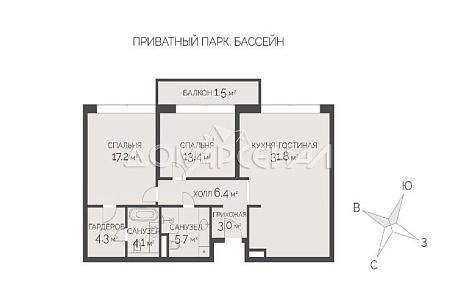 - Продуманная планировка для небольшой семьи: мастер-спальня с гардеробной и санузлом, еще одна - детская или гостевая, а, быть может, кабинет со своим балконом, зона кухни-гостиной