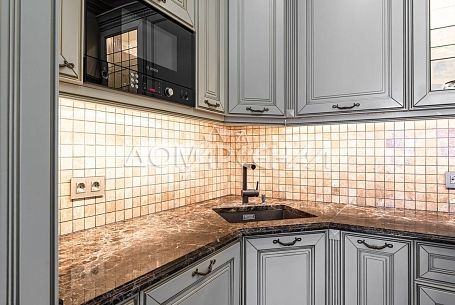- Кухня выполнена из высококачественного массива дерева, дополнена мраморной столешницей, подоконниками и удобным островом