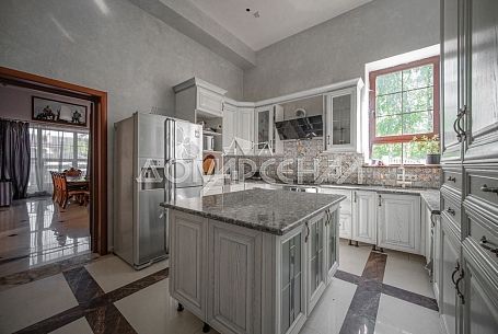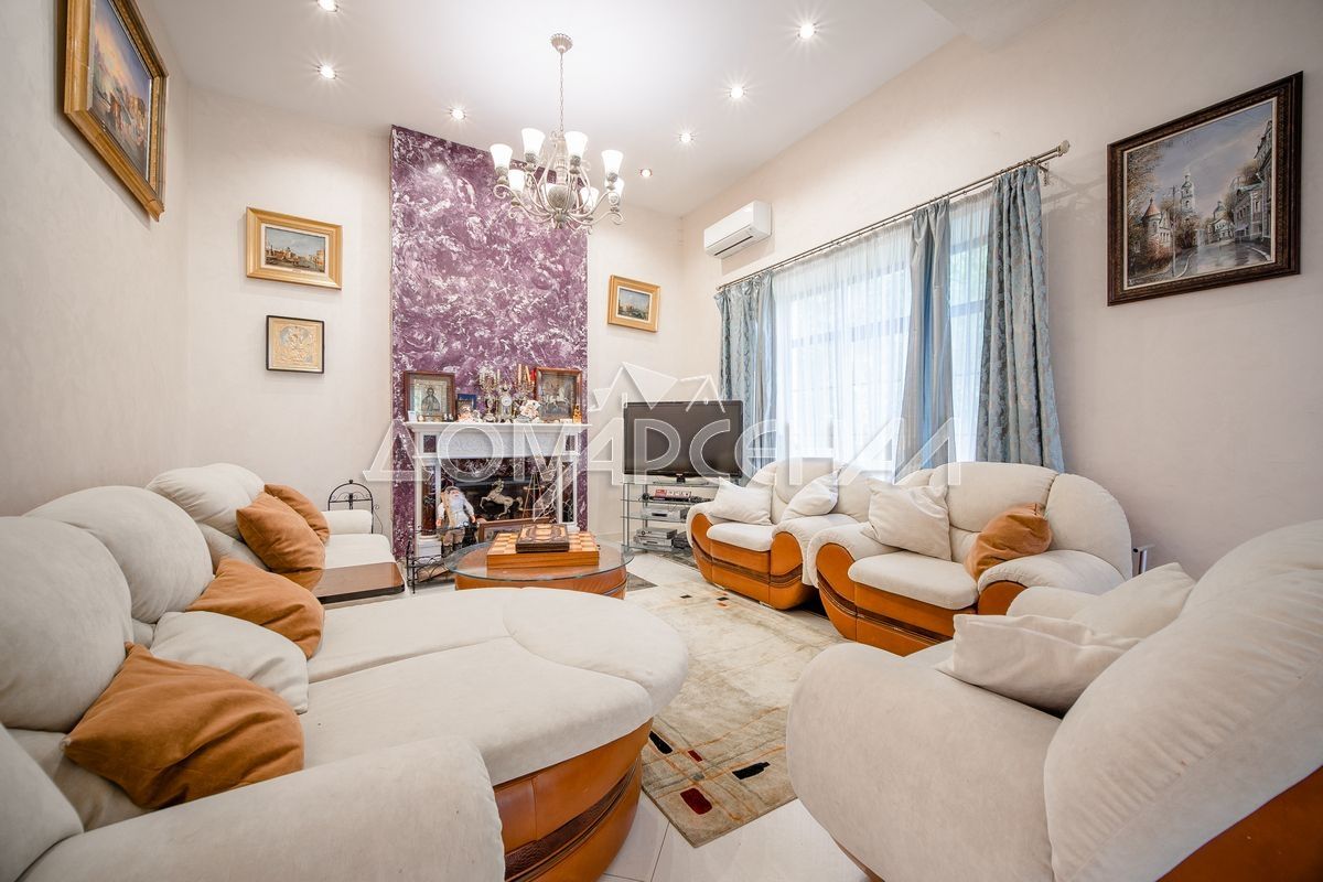 - Выполнена дизайнерская отделка, с использованием высококачественных современных материалов: стены - венецианская штукатурка, подоконники из мрамора, на первом и цокольном этажах - уникальные художественные полы с подогревом из гранита с мраморными панно. На втором - штучный паркет из массива дуба, двери итальянские из массива