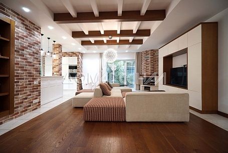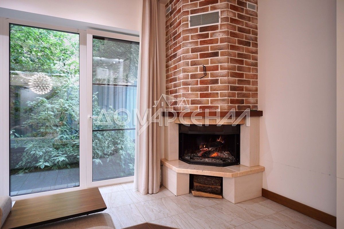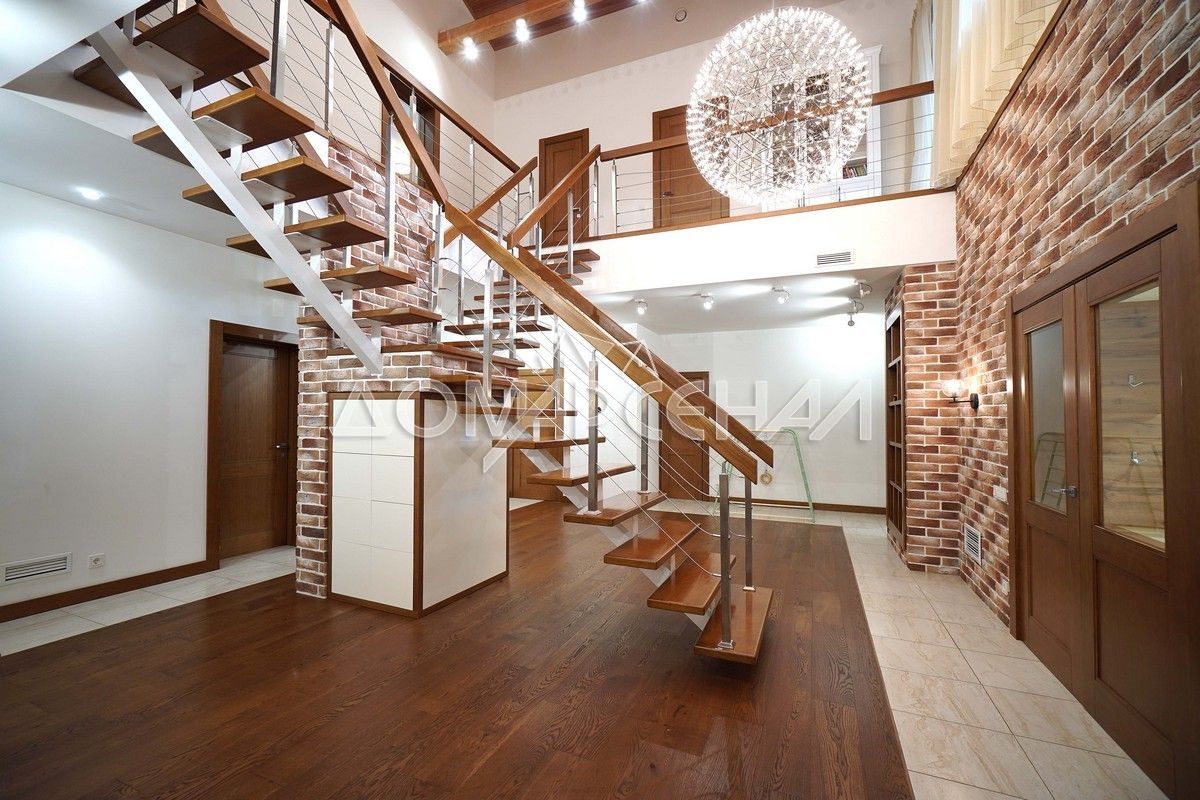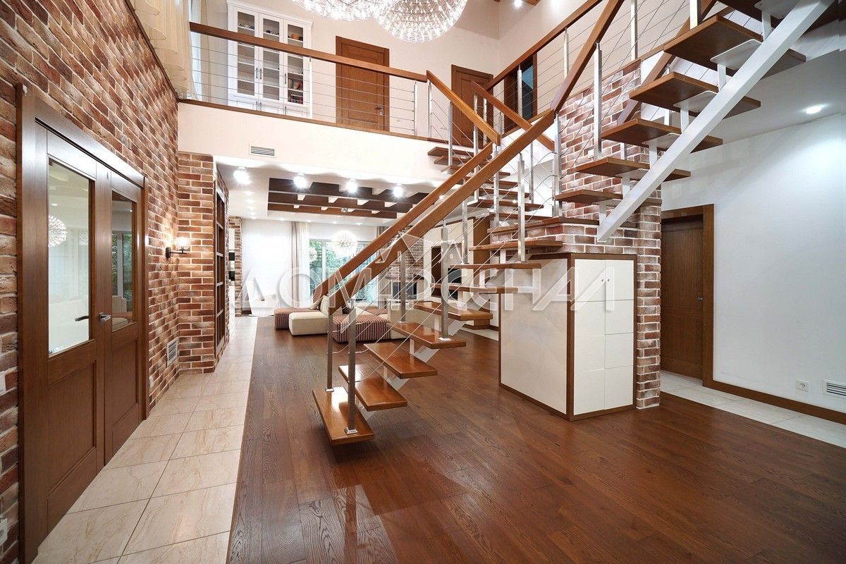 - Выполнена дизайнерская отделка с парящей лестницей и камином