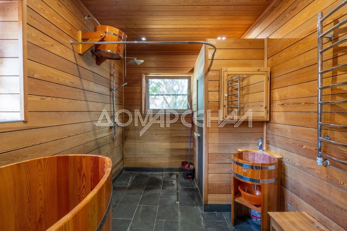 - На участке стоит сервисный дом с гаражом и домик для персонала, баня с зоной барбекю и парной, обшитой абашем