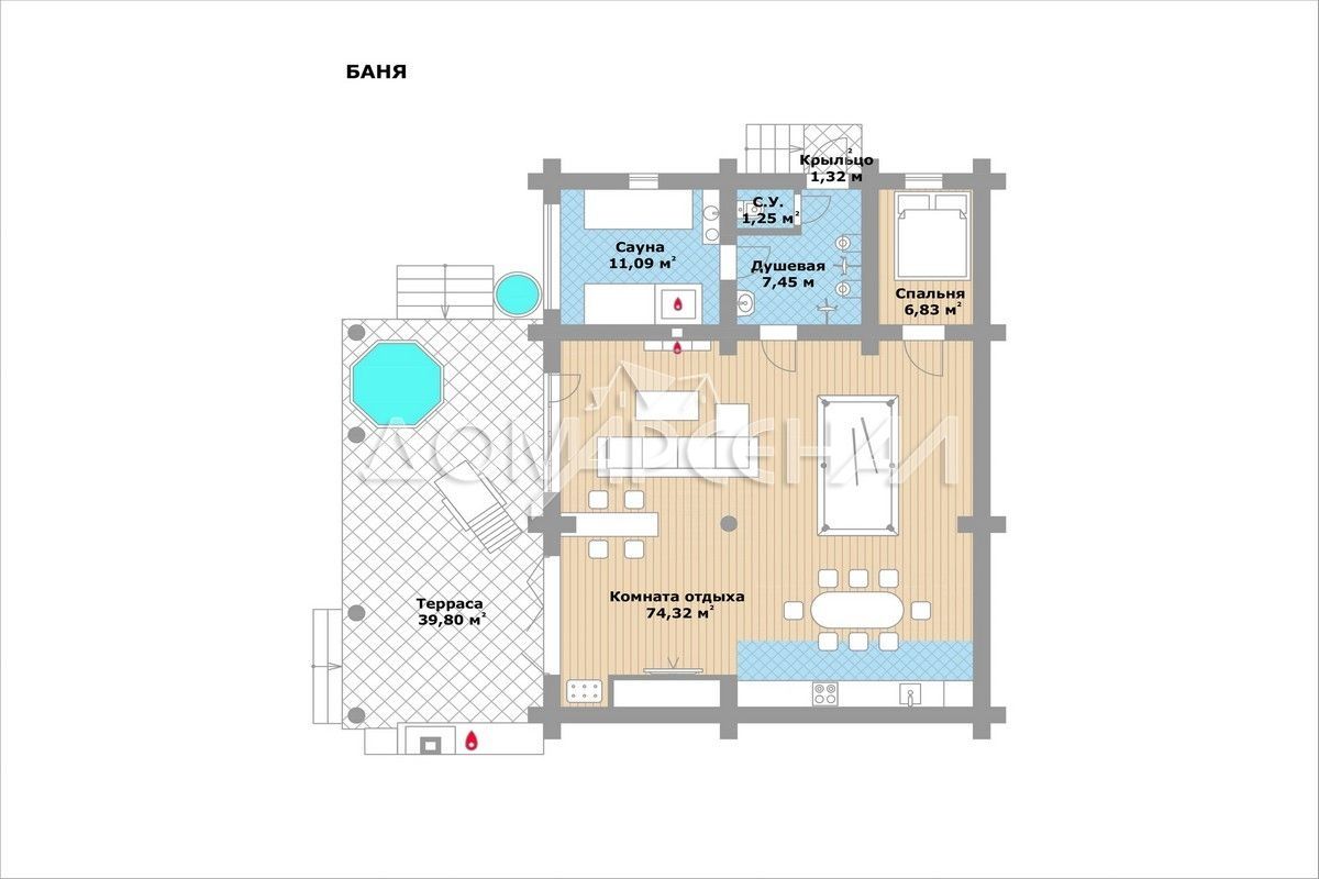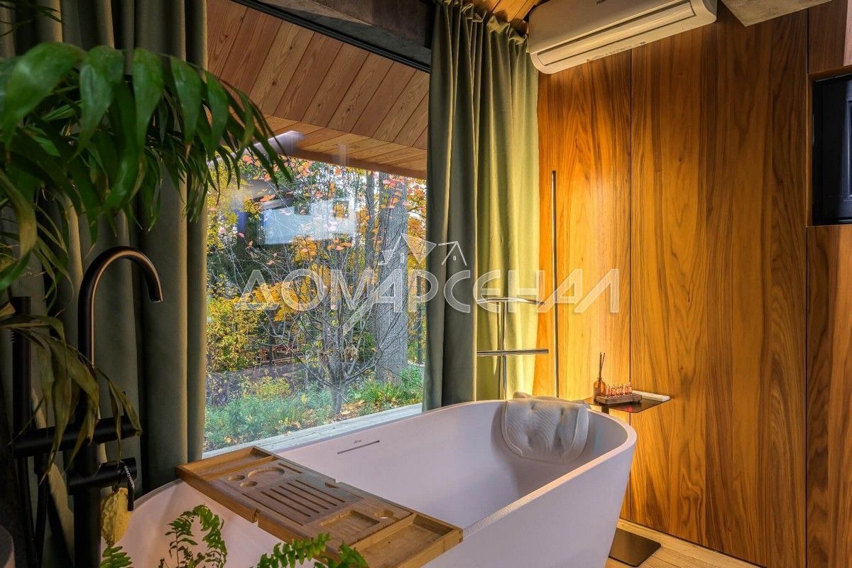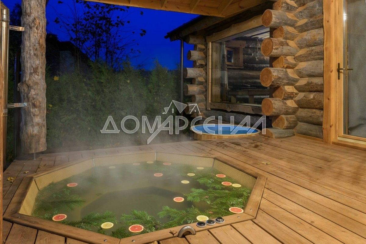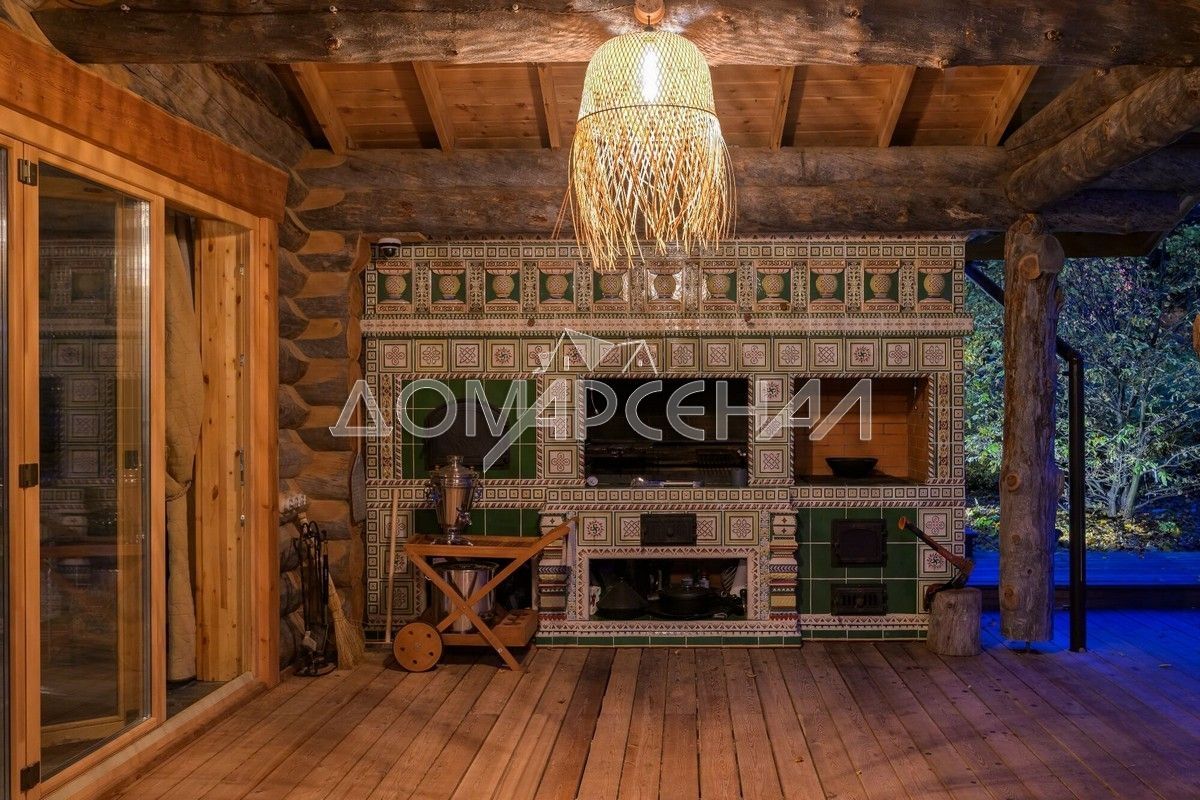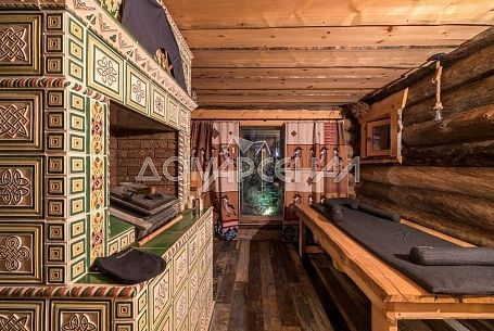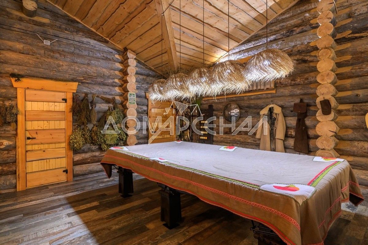 - В банном комплексе: русская печь с изразцами, на террасе - горячая встроенная фурако и холодная купель, столовая-гостиная, 12-футовый бильярд, гостевая спальня и шикарная парная комната с панорамным окном и живописным видом на участок