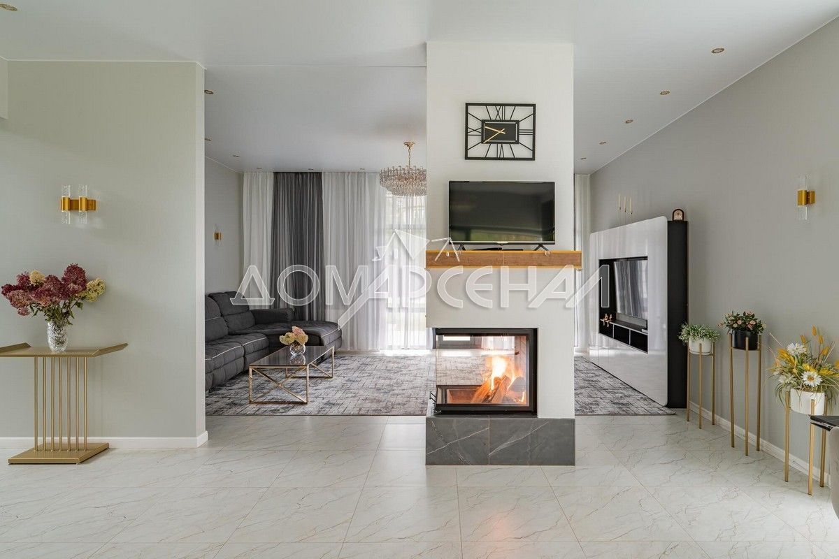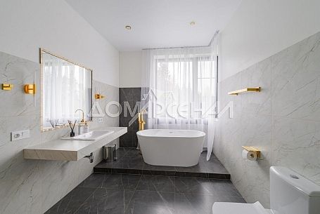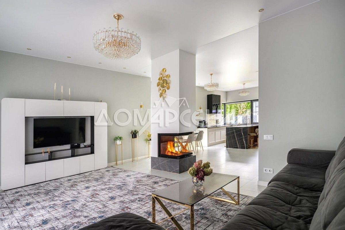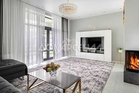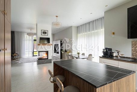 - Особенности: современная архитектура, алюминиевые окна с тонировкой стекла, продуманная планировка, светлый интерьер с элементами неоклассики, двусторонний дровяной камин, живописные виды из окон, теплые полы, сад на участке с плодовыми растениями, крытая зона барбекю, навес на 3 м/м.