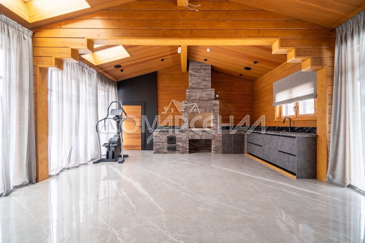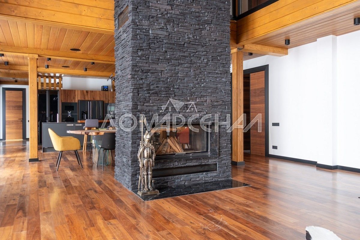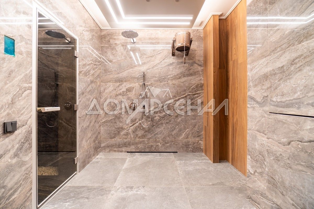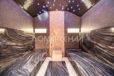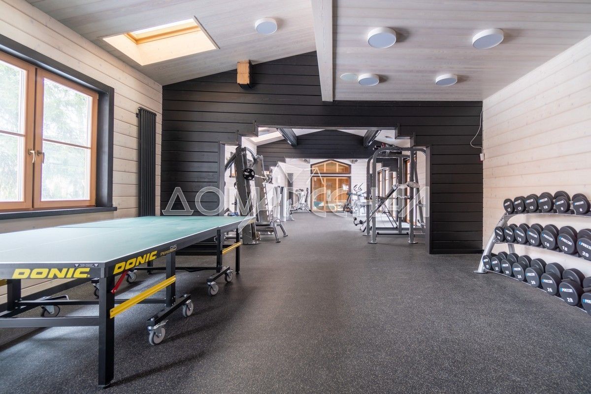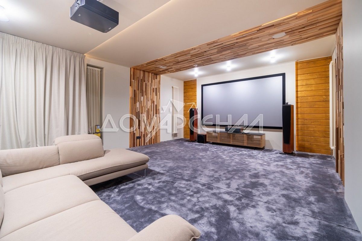- В планировке: гостиная со вторым светом, кинозал с экраном 135″, летняя кухня с печью, спортзал, хамам, баня, купель на террасе