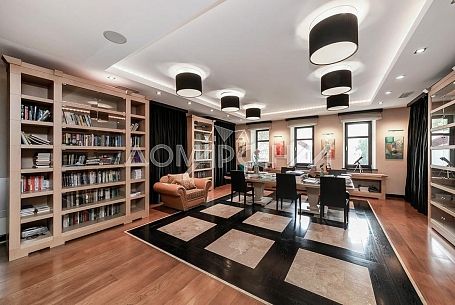 - Роскошная светлая библиотека с большими панорамными окнами и широкими мраморными подоконниками, книжные шкафы из массива дуба, большой письменный стол, многоуровневое освещение
